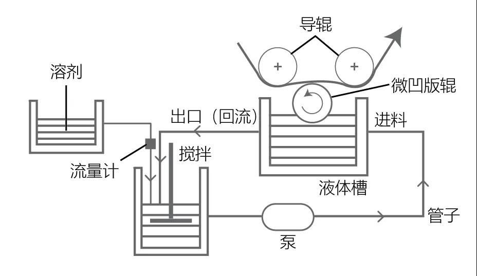 為了解決這個問題,可以在使用微凹的時候,進行回流,使得涂布液處于一個流動的狀態(tài),不容易結(jié)皮,同時在回流的時候根據(jù)溶劑的揮發(fā)速率進行溶劑的補充,從而進一步降低溶劑揮發(fā)所帶來的影響。
